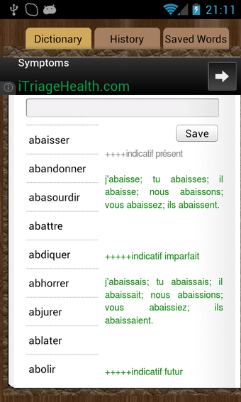 アプリケーションのインターフェースは魅力的で使いやすく、ユーザーの履歴に最新の150単語を自動的に保存する機能があります。さらに、ユーザーは自分自身の単語を保存および削除して将来の参照に使用することができます。プログラムはまた、メニューボタンをクリックすることでConjugaisonおよびDeConjugaison辞書の切り替えをユーザーに許可します。